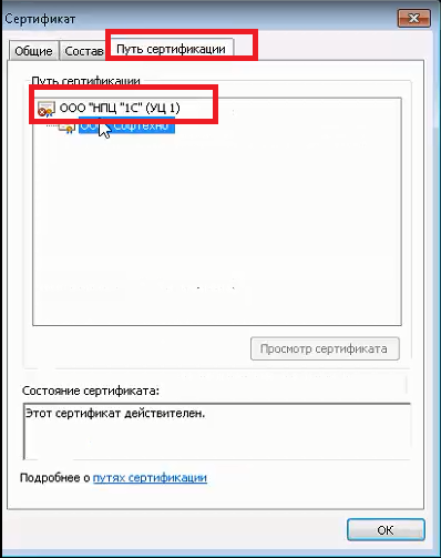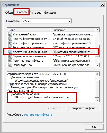 В случае если не отображается цепочка сертификатов (на закладке "Путь сертификации" есть только сертификат пользователя), перейдите на вкладку "Состав" , найдите раздел, "Доступ к информации о центре сертификации":