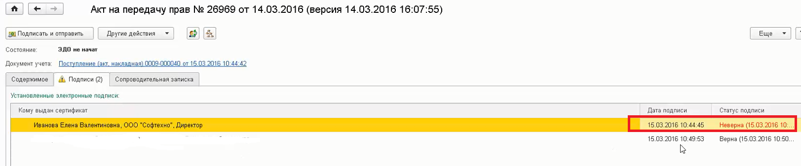 Открываем сам электронный документ, по которому выдается ошибка, на вкладке "Подписи" , содержится 1 или 2 подписи, статус одной из них, или обеих, выделен красным курсивом и статусом "Не верна".