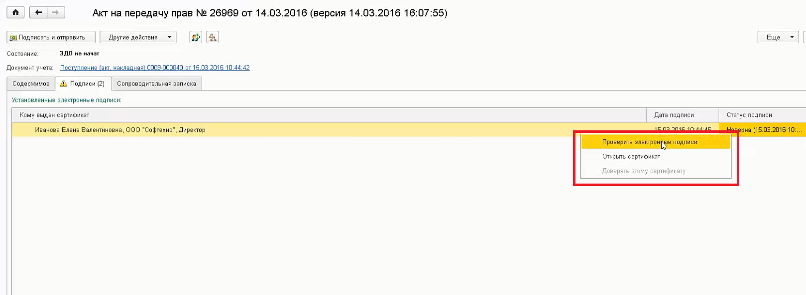 Переключившись в окно 1С, правой кнопкой мыши нажимаем на подпись со статусом "Не верна" и в контекстном меню выбираем команду "Проверить электронные подписи":