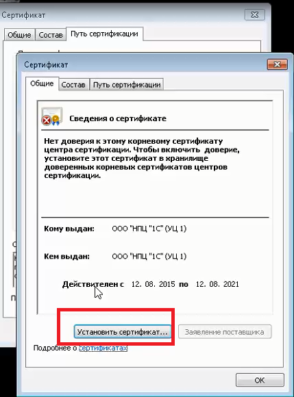 Открыв корневой сертификат (из пути сертификации в сертификате пользователя или скачанный файл) нажмите кнопку "Установить сертификат...":