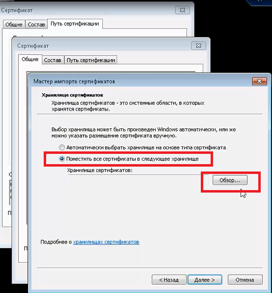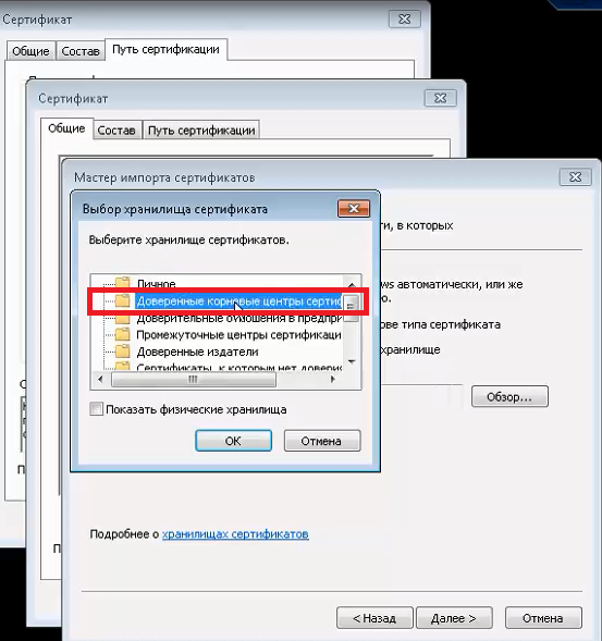 В качестве хранилища корневого сертификата необходимо выбрать "Доверенные корневые центры сертификации":