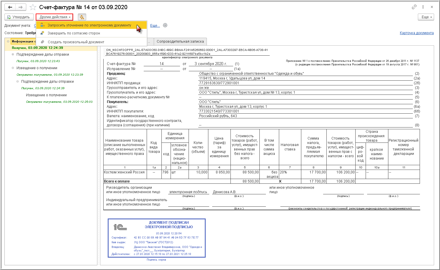 Если претензий к показателям счета-фактуры у покупателя нет, то он утверждает полученный документ. При этом продавец не получает какие-либо электронные служебные документы.