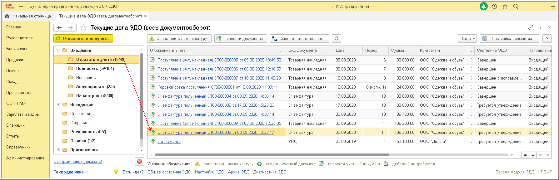 - по гиперссылки в графе "Отражение в учете" активной строки из списка "Текущие дела ЭДО" (рис. 7);