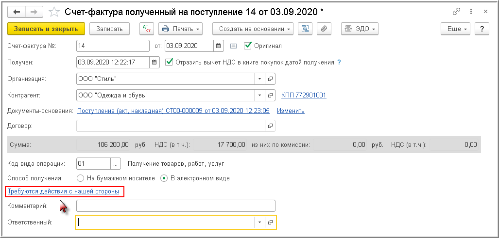 Также перейти в форму просмотра можно из нового документа учетной системы "Счет-фактура полученный", автоматически созданного на основании поступившего электронного счета-фактуры (раздел Покупки - подраздел Покупки - Счета-фактуры полученные), по гиперссылке в строке состояния обмена электронным документом Требуются действия с нашей стороны (рис. 3).