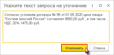 После выполнения команды Запросить уточнение по электронному документу программа предложит ввести текст запроса на уточнение и нажать кнопку Отклонить (рис. 4).
