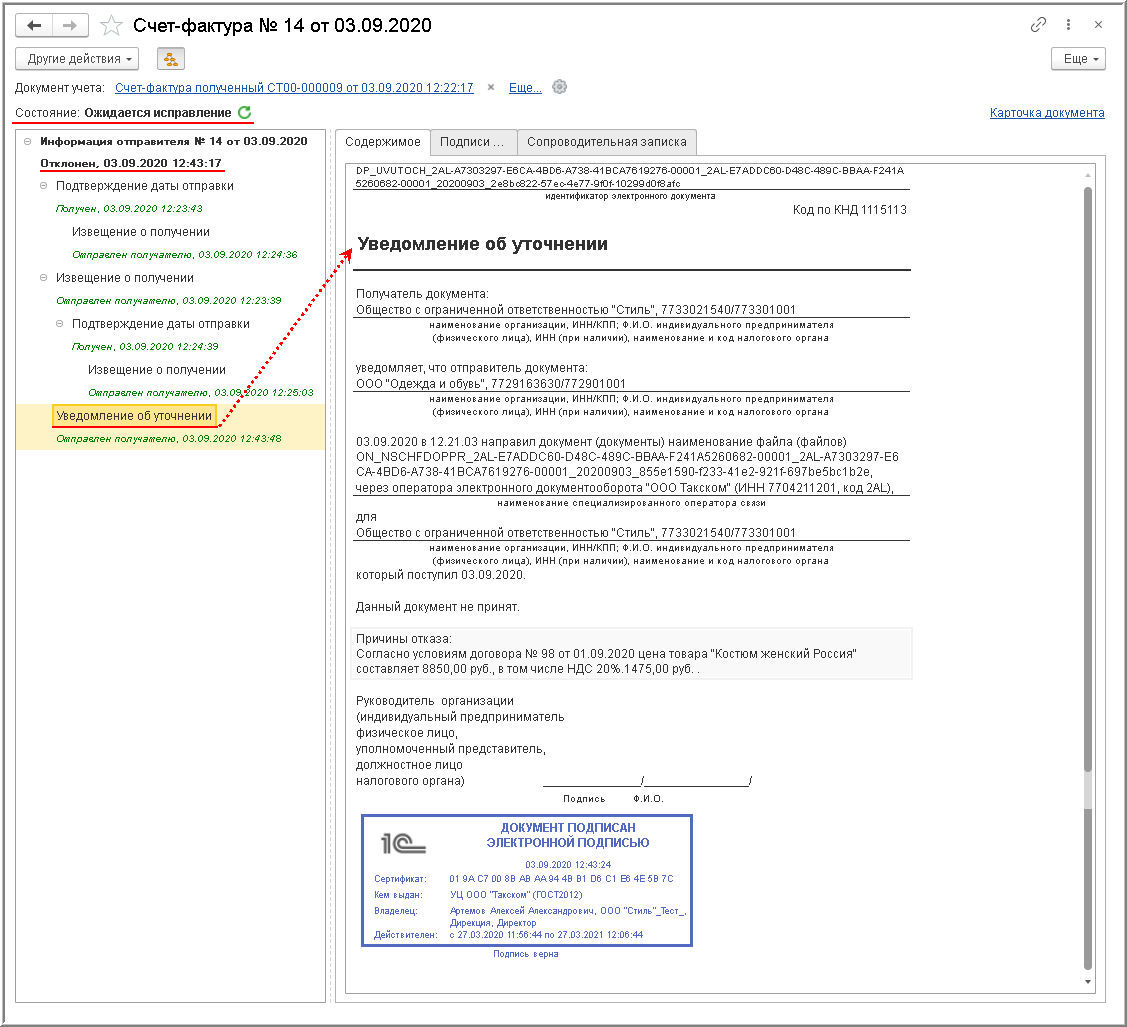 После отклонения поступившего счета-фактуры будет автоматически сформировано уведомление об уточнении.