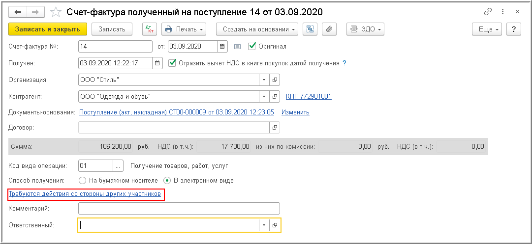 В автоматически сформированном документе "Счет-фактура полученный" в строке состояния электронного обмена будет отражена информация Требуются действия со стороны других участников (рис. 6).