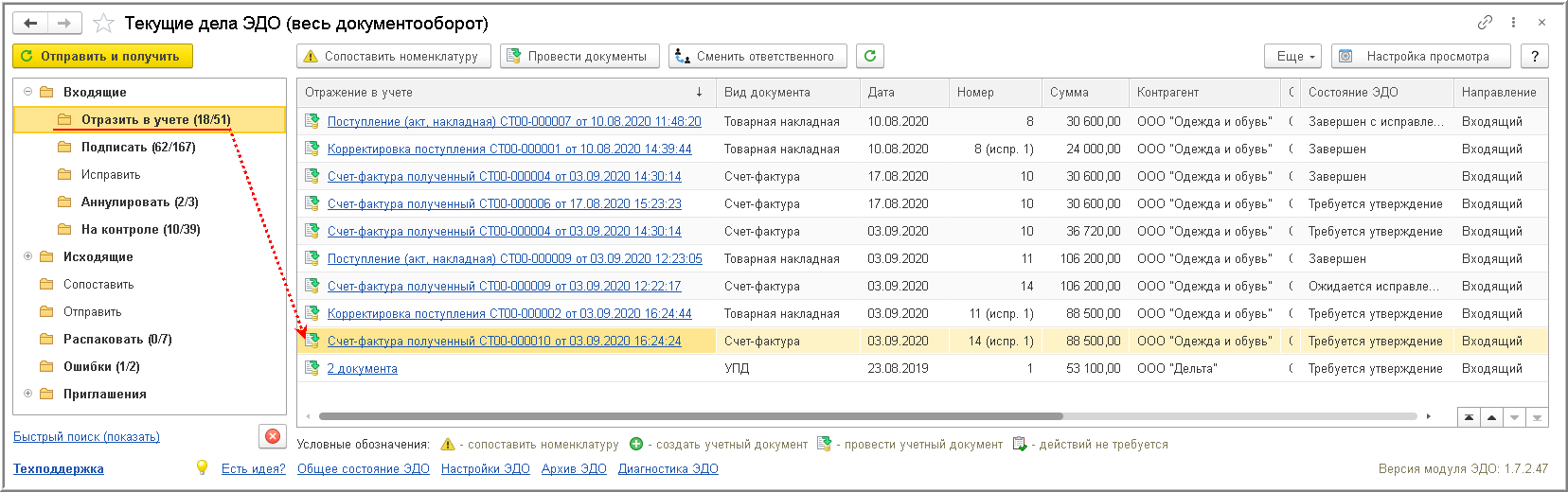 Поступивший исправленный электронный счет-фактура помещается в папку "Отразить в учете" списка входящих документов формы "Текущие дела ЭДО" (рис. 7).