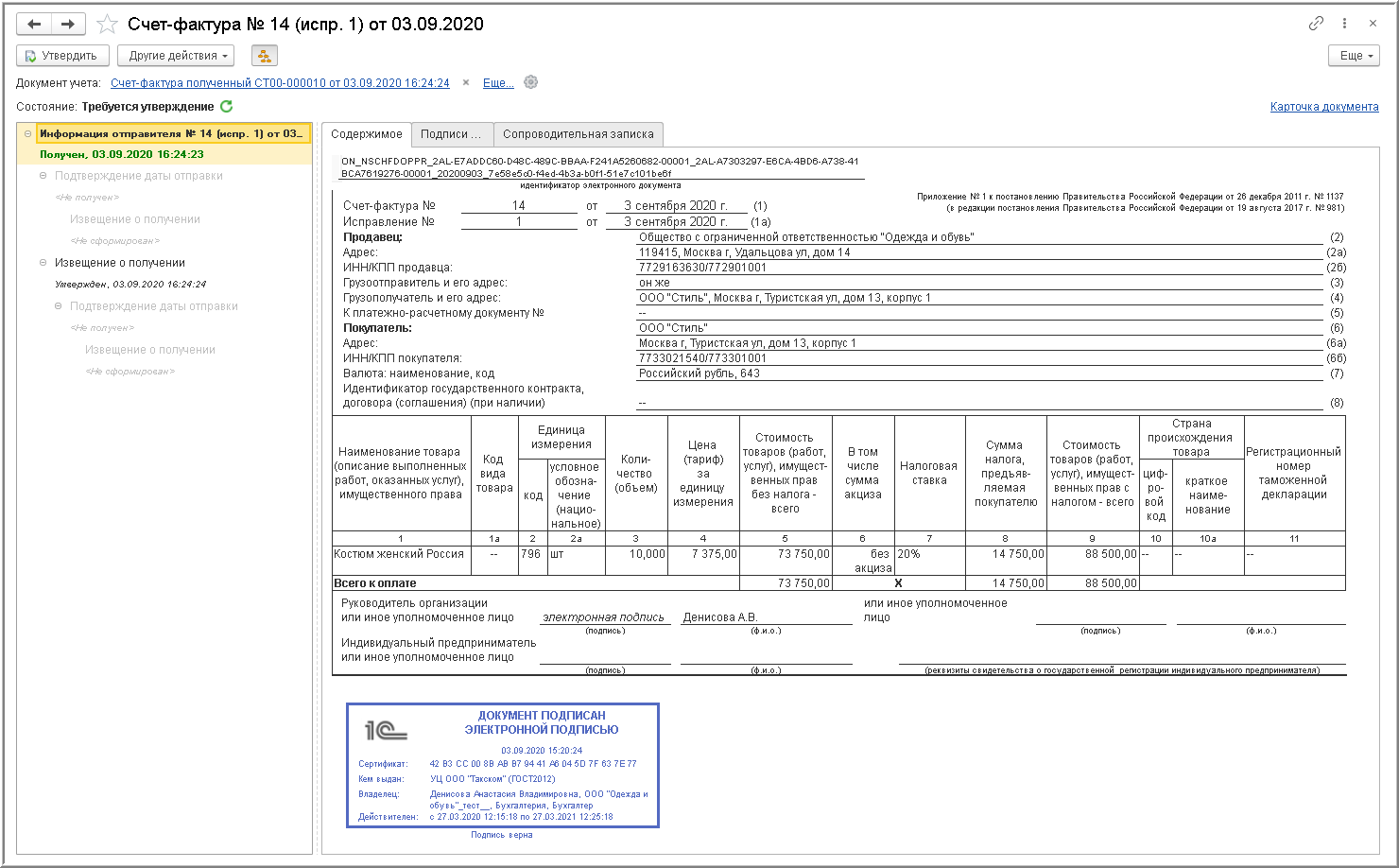 - в информационной строке состояния формы просмотра поступившего электронного счета-фактуры ("Состояние:"), где будет отражена информация "Требуется утверждение" (рис. 8);