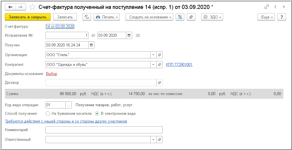 Получение и отражение в учете входящего исправленного ЭСФ