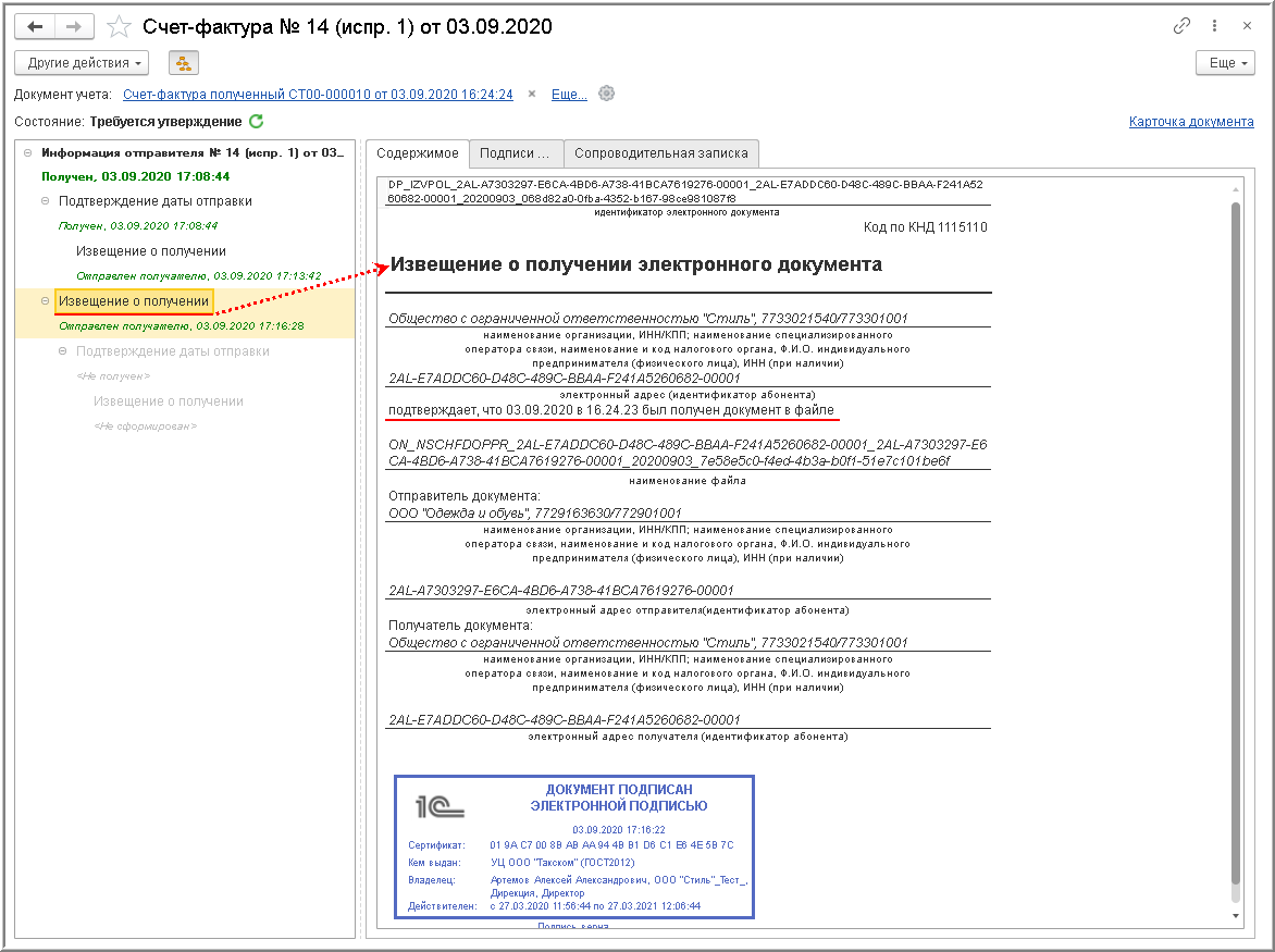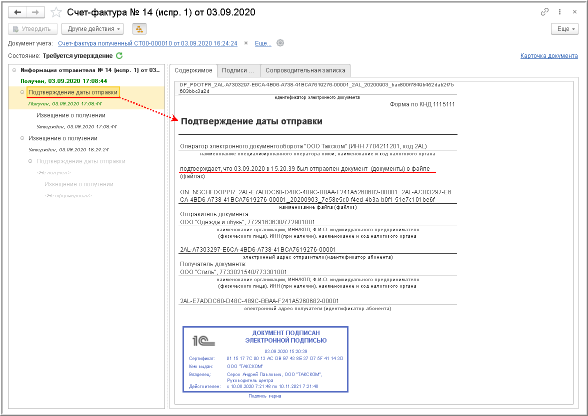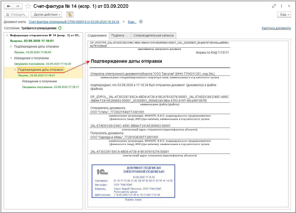 Процедура утверждения поступившего электронного счета-фактуры Порядком обмена не предусмотрена, однако она важна для внутреннего контроля за достоверностью поступившего электронного документа.