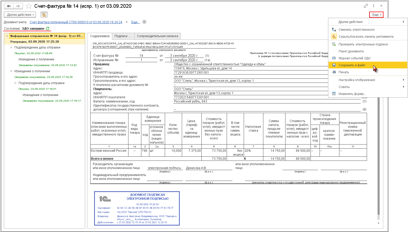 Также из формы просмотра, вызвав команду Сохранить в файл из списка доступных команд, открываемого по кнопке Еще, можно сохранить электронный счет-фактуру вместе с электронной подписью.