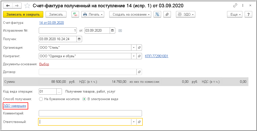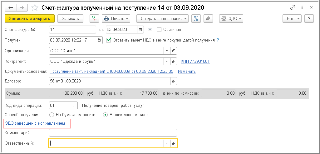 В информационной строке состояния электронного обмена документа "Счет-фактура полученный" будет установлено значение ЭДО завершен (рис. 15).