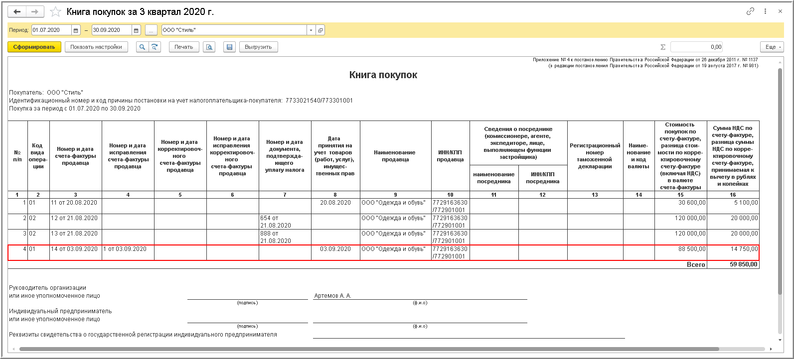 Поскольку полученный электронный счет-фактура требует исправления, даже при наличии флажка в строке "Отразить вычет НДС в книге покупок датой получения" в документе "Счет-фактура полученный", такой счет-фактура не будет зарегистрирован в книге покупок за 3 квартал 2020 года.