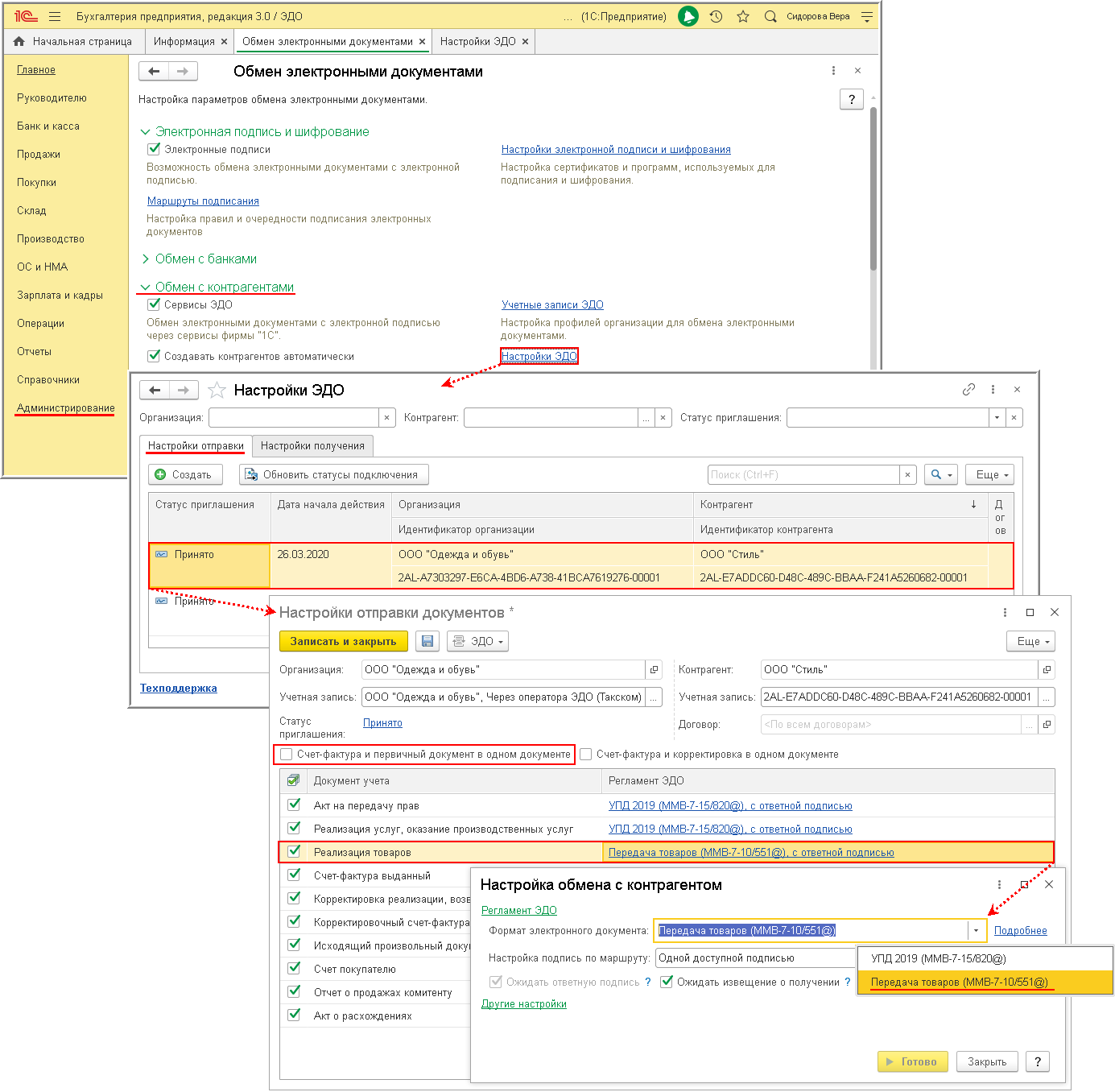 Выбрать применяемый вид Товарной накладной можно из формы "Настройки ЭДО" (раздел Администрирование - Обмен электронными документами - Обмен с контрагентами - Настройки ЭДО) (рис. 1).