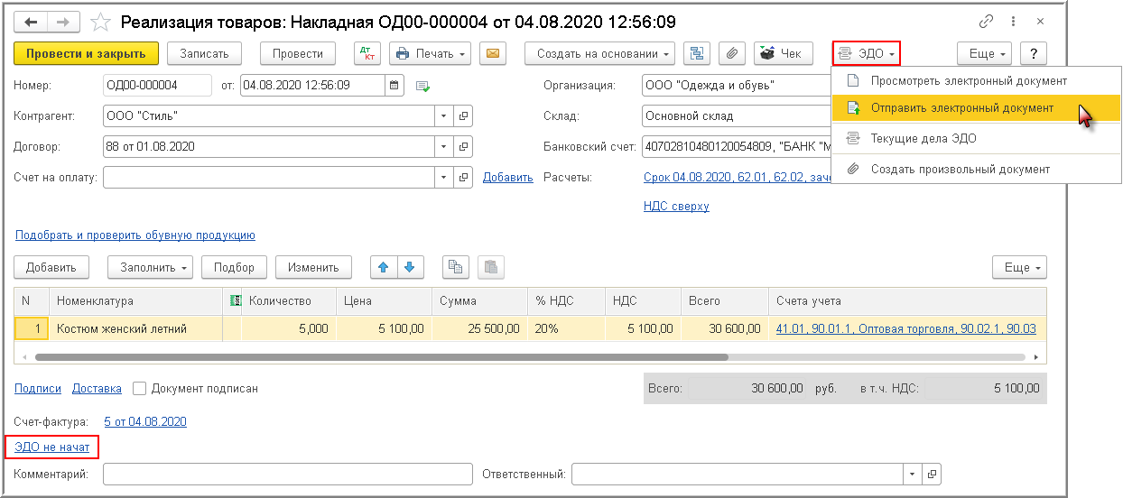 До начала формирования электронной Товарной накладной гиперссылка под табличной частью документа "Реализация (акт, накладная)", отражающая текущее состояние обмена электронным документом, будет содержать значение ЭДО не начат.