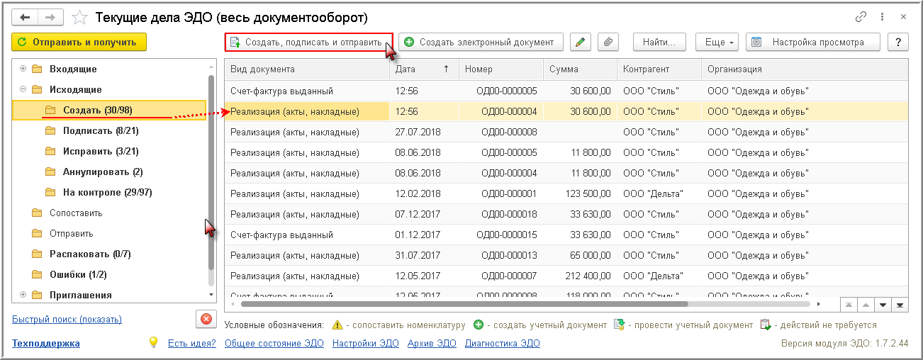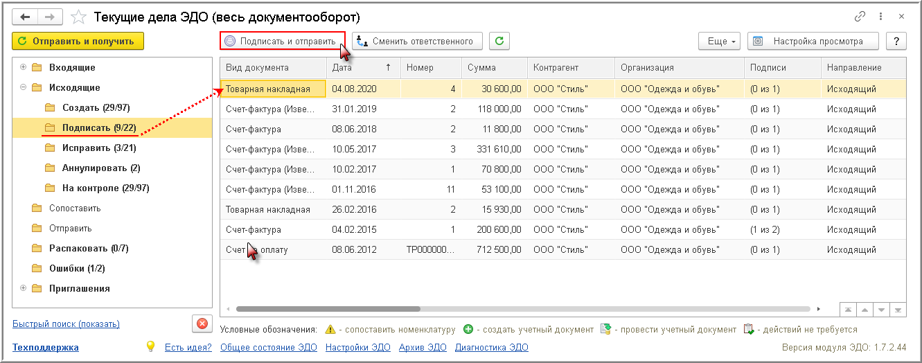 Если у текущего пользователя нет права подписи, то даже при выполнении команды Отправить электронный документ из документа "Реализация (акт, накладная)" или команды Создать, подписать и отправить из списка "Текущие дела ЭДО" (рис. 3) программа направит сформированную электронную Товарную накладную на подпись лицу, имеющему такое право. Подписать сформированный электронный документ можно по кнопке Подписать и отправить из папки "Подписать" списка исходящих документов "Текущие дела ЭДО" (или Подписать, если установлена отложенная отправка электронных документов, о чем будет написано далее).