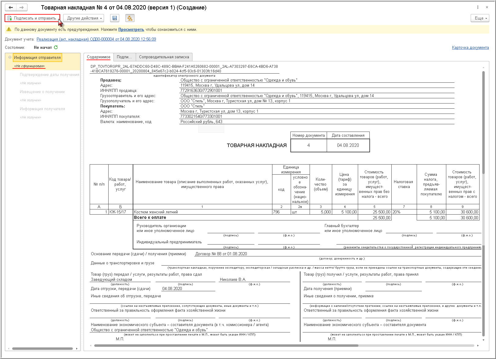 Из формы просмотра также можно выполнить формирование, подписание и отправку электронной Товарной накладной с помощью кнопки Подписать и отправить.