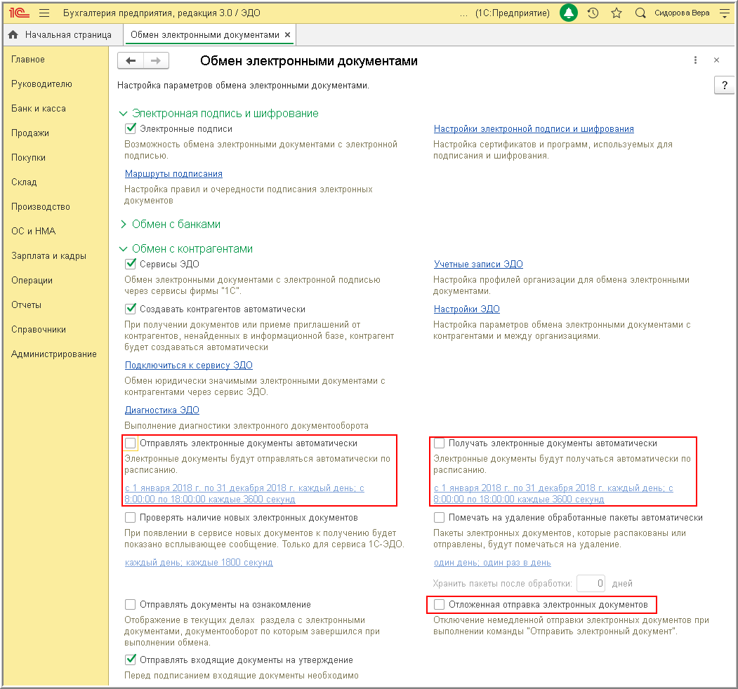 - Отправить и получить электронные документы (раздела Администрирование - подраздела Сервис);