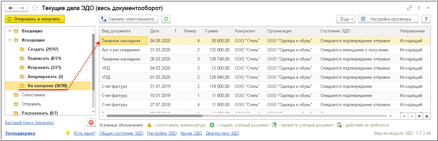 Отправленная Товарная накладная, в отношении которой ожидается получение подтверждения оператора ЭДО и информации покупателя, перекладывается в папку документов "На контроле" формы списка исходящий документов "Текущие дела ЭДО" (рис. 8).
