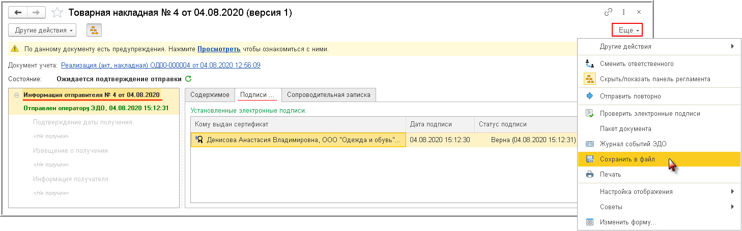 Из формы просмотра, вызвав команду Сохранить в файл из списка доступных команд, открываемого по кнопке Еще, можно сохранить электронную Товарную накладную вместе с электронной подписью.