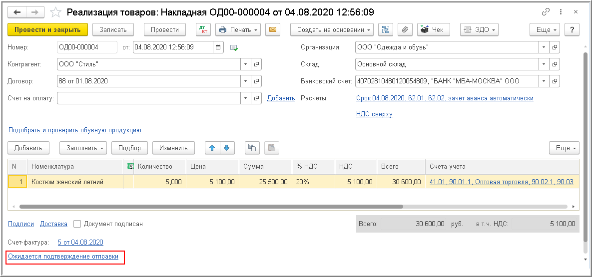 После формирования, подписания и отправки Товарной накладной (информации продавца) в документе "Реализация (акт, накладная)" в строке состояния будет содержаться информация "Ожидается подтверждение отправки" (рис. 10).