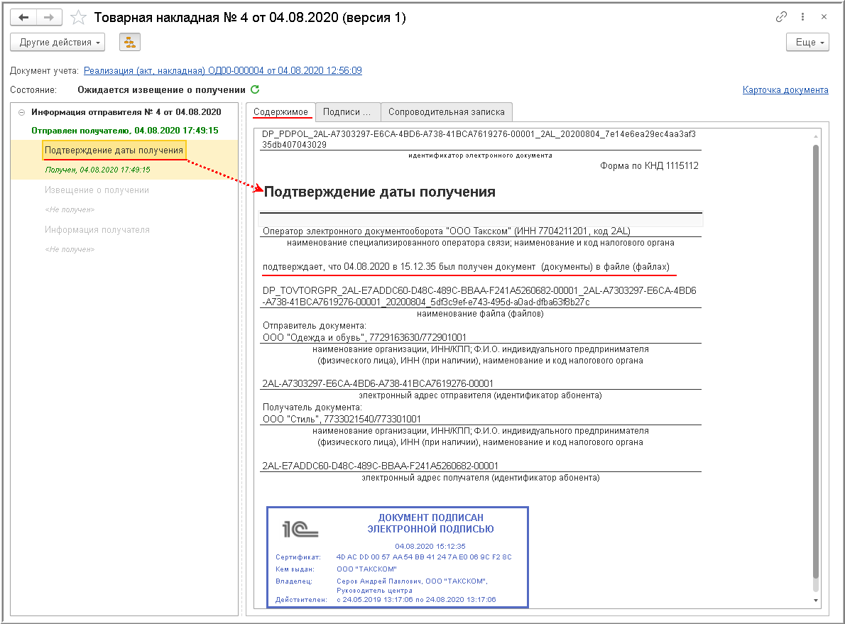 После отправки электронной Товарной накладной продавец должен получить от оператора ЭДО подтверждение с указанием даты и времени поступления ему файла Товарной накладной.