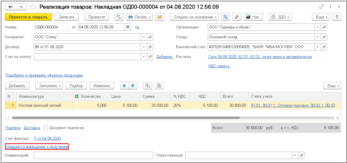 После получения подтверждения от оператора ЭДО в информационной строке документа "Реализация (акт, накладная)" будет отражена информация Ожидается извещение о получении (рис. 12).