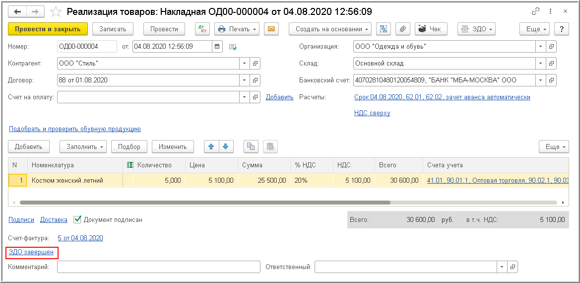 Получение продавцом таких документов от покупателя происходит при очередном сеансе связи с оператором ЭДО, после чего в документе "Реализация (акт, накладная)" в информационной строке состояния электронного обмена появится статус ЭДО завершен (рис. 13).