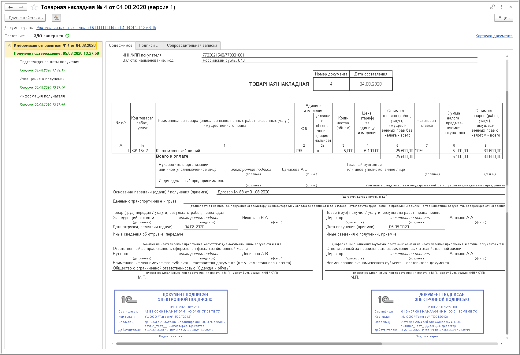 Если у текущего пользователя есть право подписи и сертификат подписи установлен на компьютере, то после выполнения команды Отправить электронный документ из документа "Реализация (акт, накладная)" программа отправит подписанный электронный документ контрагенту (или подготовит подписанную Товарную накладную для отправки, если установлена отложенная отправка электронных документов, о чем будет написано далее).
