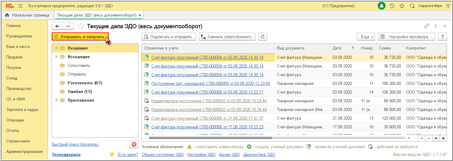 - по кнопке Отправить и получить из списка "Текущие дела ЭДО" (раздел Администрирование - подраздел Сервис или раздел Руководителю - подраздел Сервис, или раздел Продажи - подраздел Сервис);
