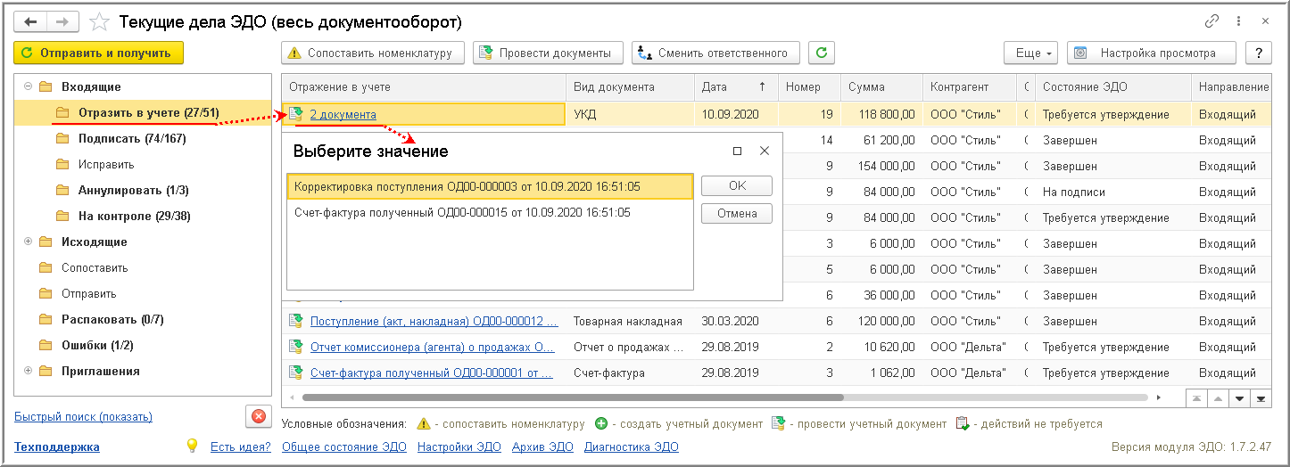 - по гиперссылки в графе "Отражение в учете" активной строки из списка "Текущие дела ЭДО" (рис. 2);