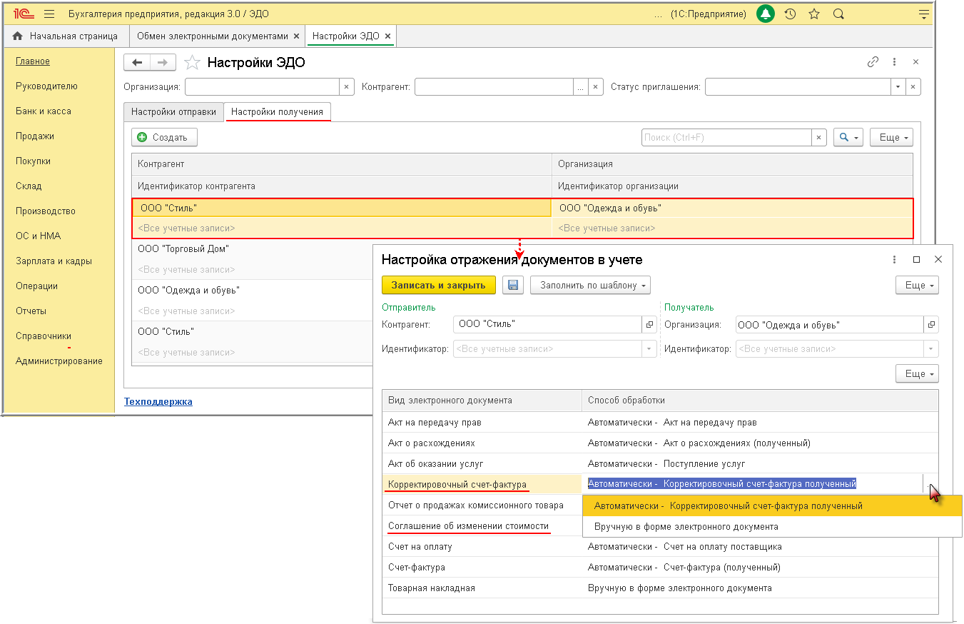 Для настройки отражения поступающих электронных документов в учетной системе из формы "Настройки ЭДО" (раздел Администрирование - Обмен электронными документами - Обмен с контрагентами - Настройки ЭДО), находясь на закладке "Настройки получения" и дважды щелкнув по строке, отражающей ЭДО с конкретным контрагентом, необходимо перейти в форму "Настройка отражения документов в учете" и установить способ обработки поступающих электронных документов: "Автоматически" или "Вручную в форме электронного документа" (рис. 3).
