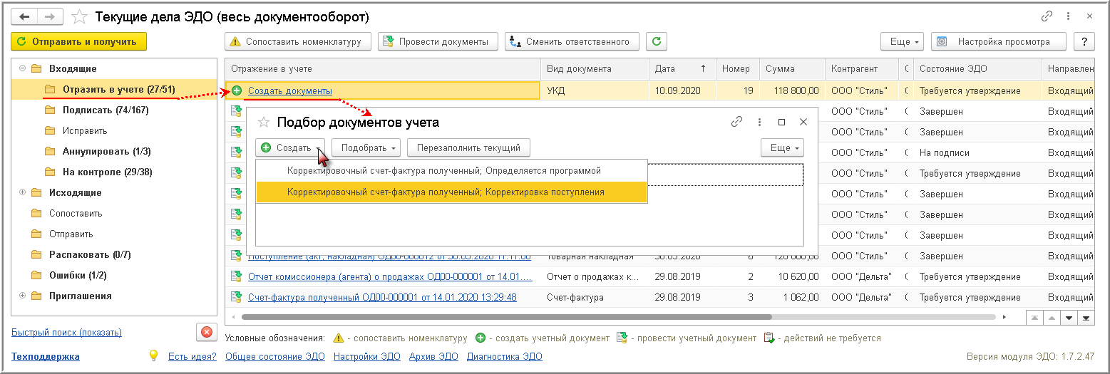В случае, если в настройках ЭДО (раздел Администрирование - Обмен электронными документами - Обмен с контрагентами - Настройки ЭДО) дополнительно установлен флажок для значения "Отправлять входящие документы на утверждение", то поступивший УКД будет помещен также в дополнительную папку "Утвердить" списка входящих документов формы "Текущие дела ЭДО".