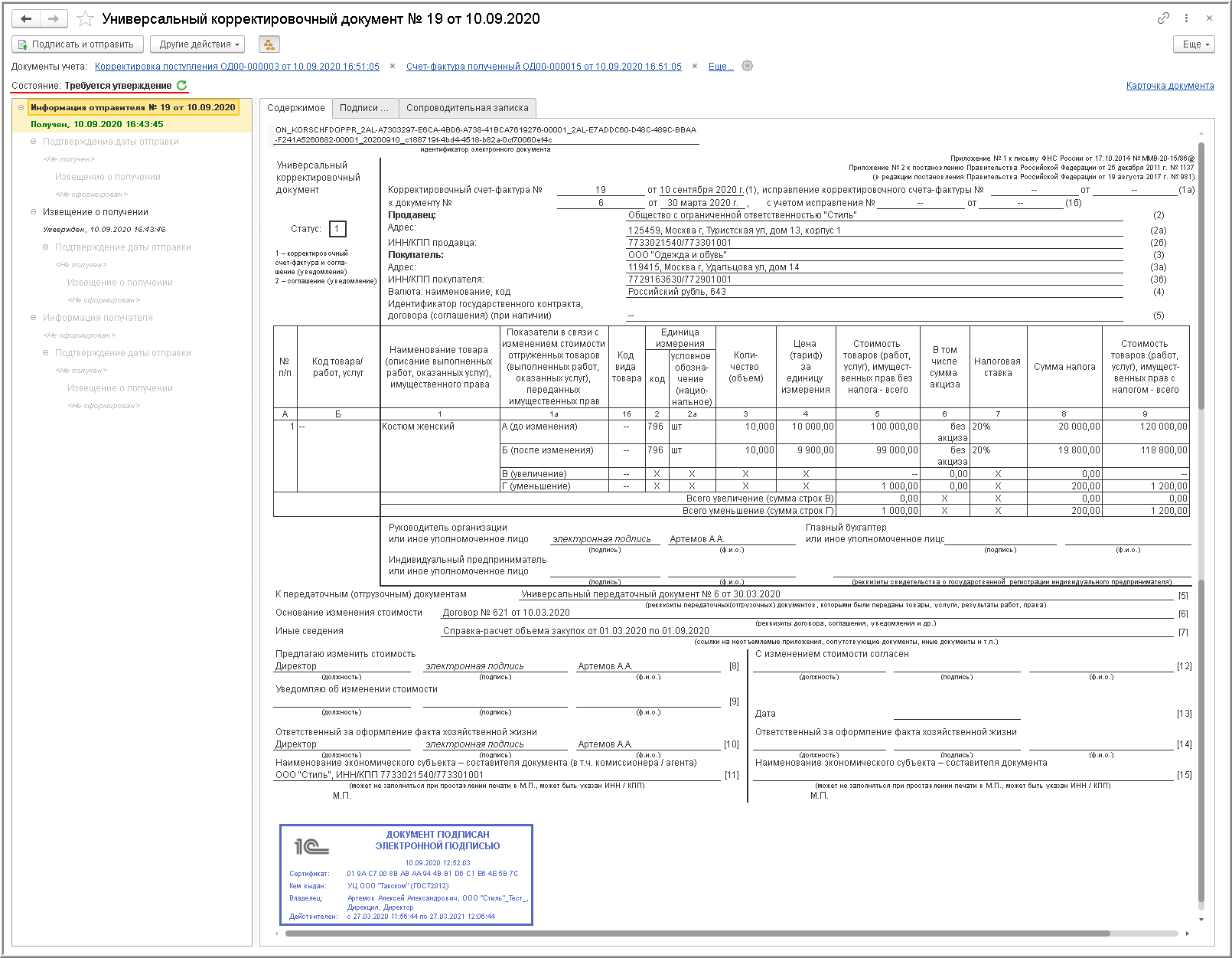 В то же время для УКД, как документа о согласовании изменения стоимости товаров, данная процедура обязательна, поскольку после утверждения поступившего УКД (информации продавца) автоматически формируется соответствующая информация покупателя.