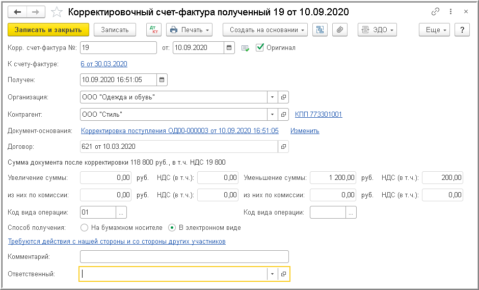 В строке "К счету-фактуре" будет размещена гиперссылка на корректируемый полученный счет-фактуру, а в строке "Документы-основания" - гиперссылка на соответствующий документ корректировки поступления, автоматически сформированный также на основании поступившего электронного УКД.