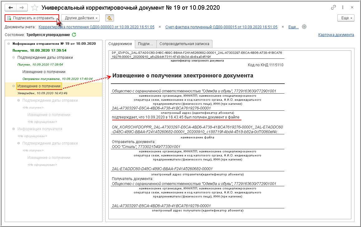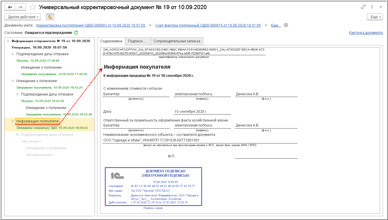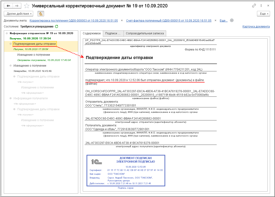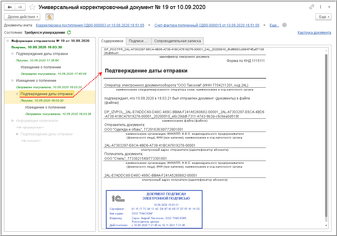 Дата отправления, указанная в этом подтверждении оператора ЭДО (рис. 8), будет признаваться датой получения покупателем корректировочного счета-фактуры, входящего в УКД (п. 1.11 Порядка обмена).