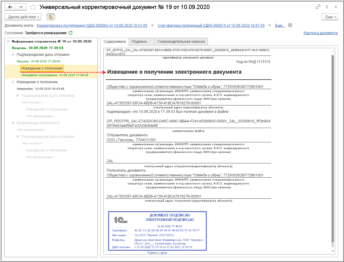 После получения всех необходимых служебных документов обмен электронным УКД у покупателя будет завершен.