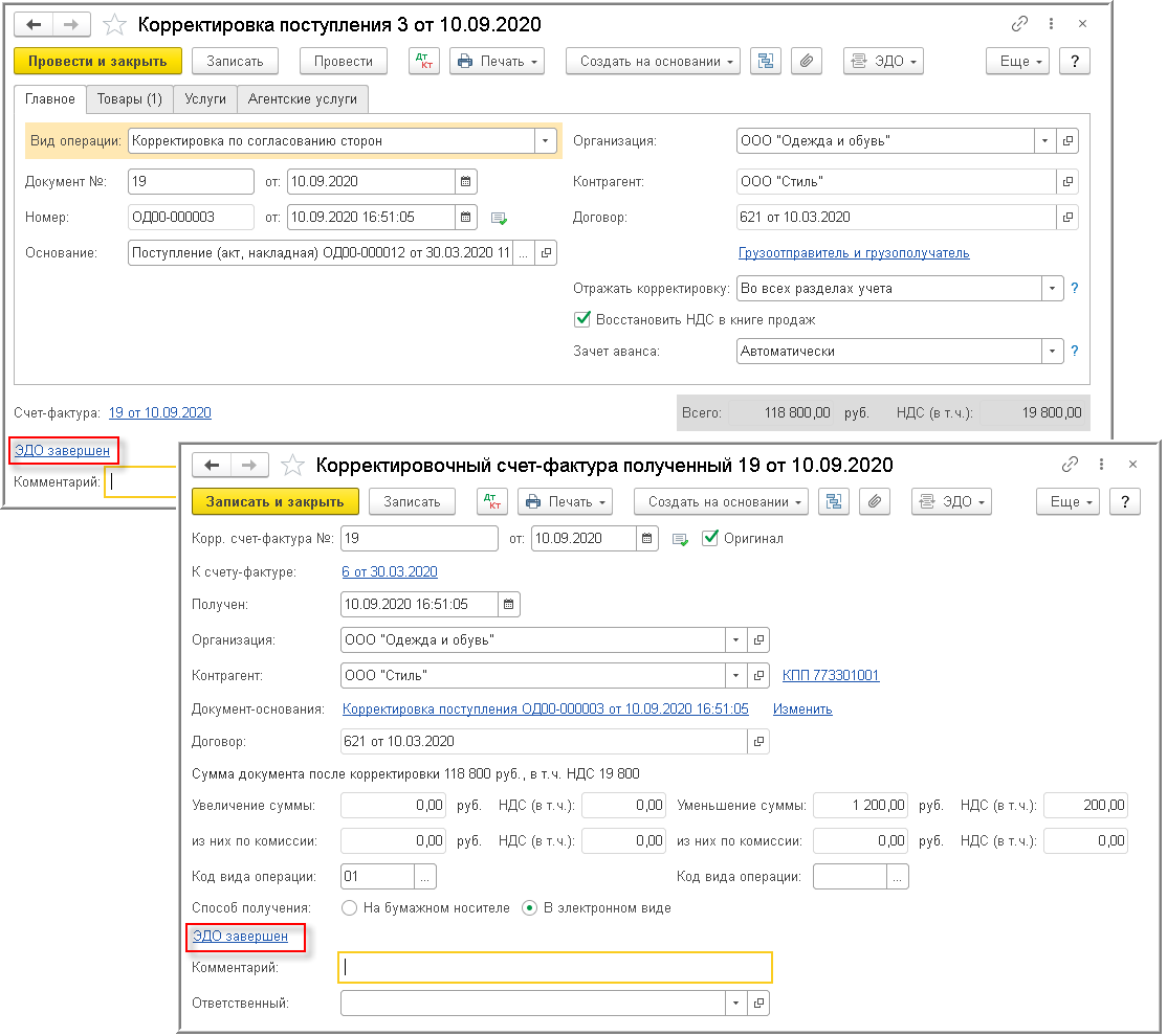 После завершения обмена электронным УКД в строке состояния электронного обмена документов "Корректировка поступления" и "Корректировочный счет-фактура полученный" будет отражена информация ЭДО завершен (рис. 14).