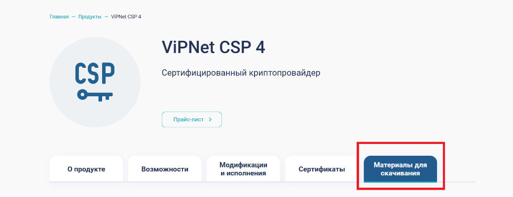 - Скачайте дистрибутив, для этого перейдите на станицу продукта ViPNet CSP и откройте вкладку «Материалы для скачивания» (рис. 3).