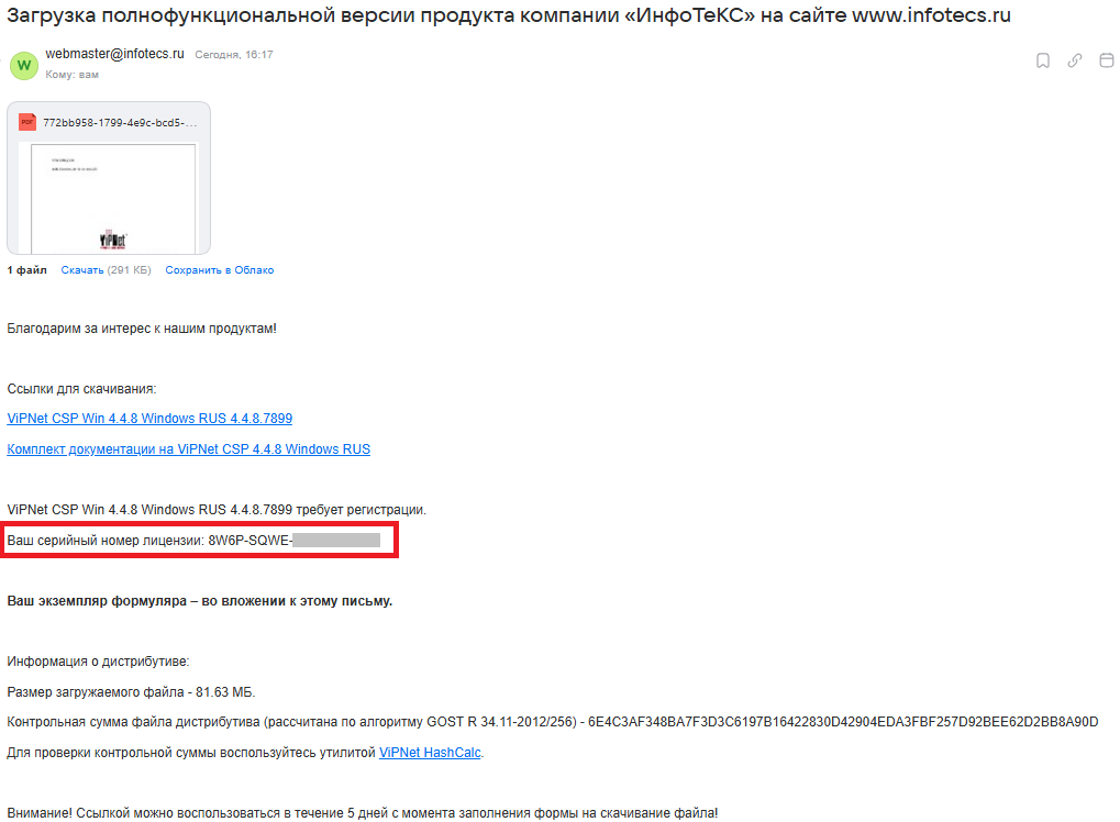 - Перейдите в письмо, отправленное Вам на e mail, указанный при регистрации на сайте infotecs.ru. Здесь находится ссылка для загрузки дистрибутива и серийный номер (Рис. 5).