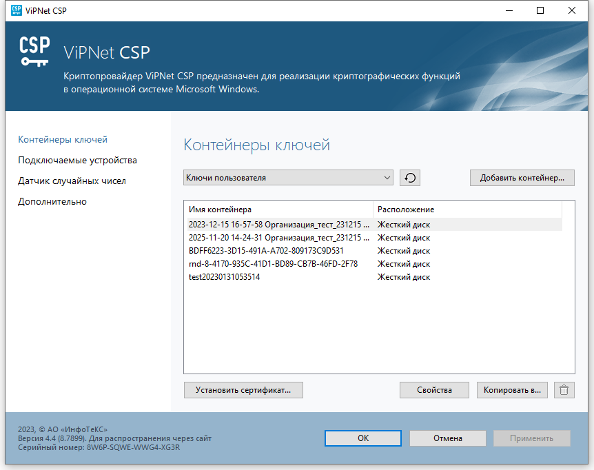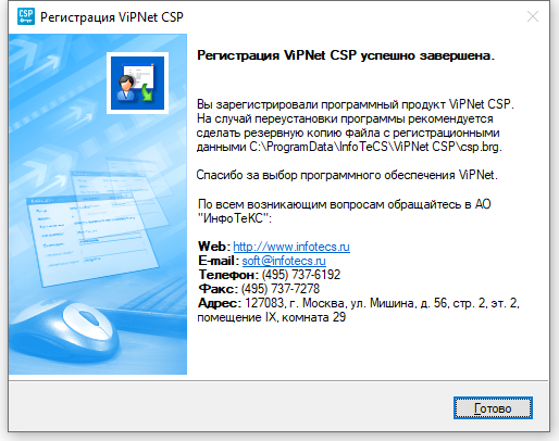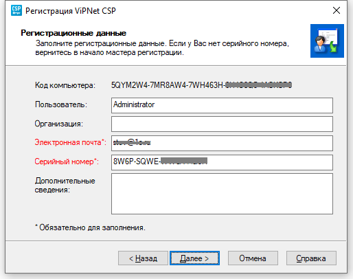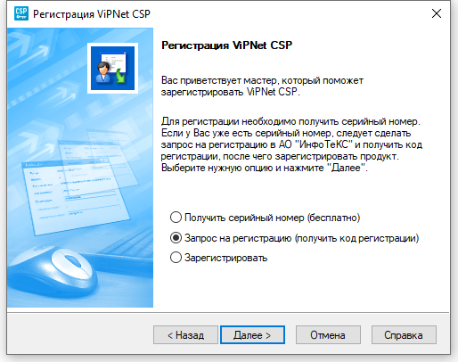 Если вы ранее использовали программу ViPNet CSP (например, более ранней версии), то регистрация может не понадобиться и все последующие шаги по регистрации будут пропущены. В этом случае, программа будет сразу доступна для использования.