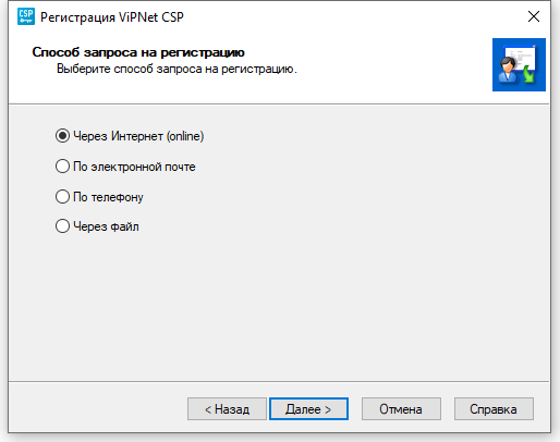 - В окне "Способ запроса на регистрацию" выберите пункт "Через Интернет (online)" (рис. 13).