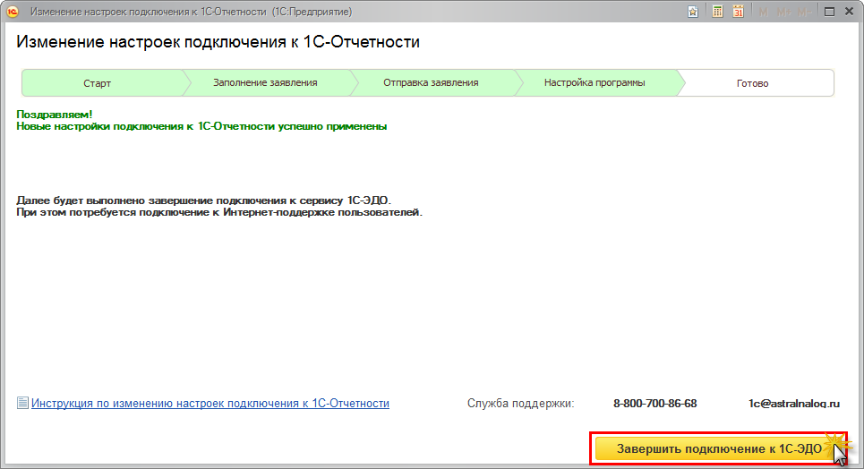 Если при подготовке заявления на изменение настроек был установлен флажок "Подключиться к сервису" для подключения к сервису 1С-ЭДО, программа предложит завершить подключение к сервису при выполнении завершающих шагов при изменении настроек подключения к 1С-Отчетности.