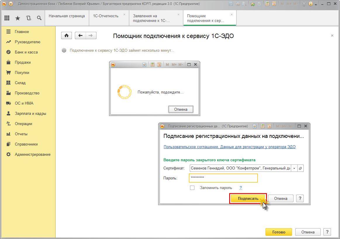 В форме диалога "Подписание регистрационных данных на подключение" введите пароль и нажмите кнопку "Подписать".