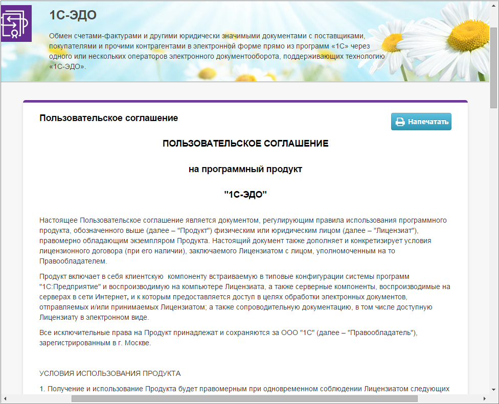 По ссылке "Пользовательское соглашение. Данные для регистрации у оператора ЭДО" можно посмотреть пользовательское соглашение на программный продукт "1С-ЭДО" (рис. 5).