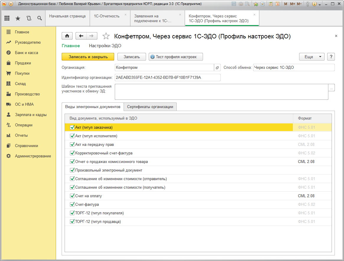 В появившейся форме "Профиль настроек ЭДО" можно настроить виды электронных документов, которыми организация планирует обмениваться с контрагентами (рис. 7).