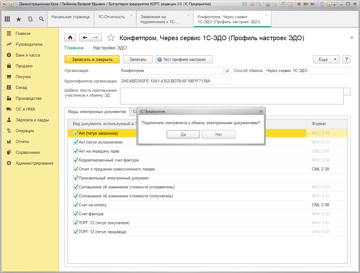 При нажатии на кнопку "Записать и закрыть" в форме "Профиль настроек ЭДО" появляется диалог, предлагающий подключить первого контрагента к обмену электронными документами (рис. 8).