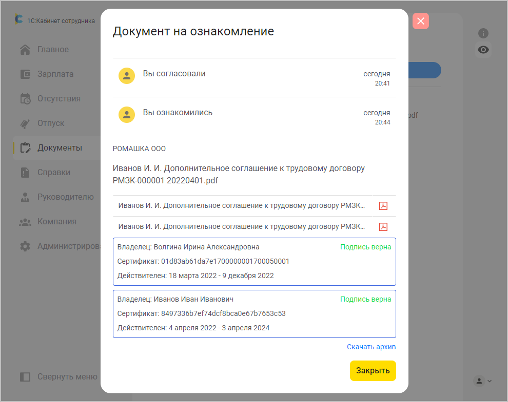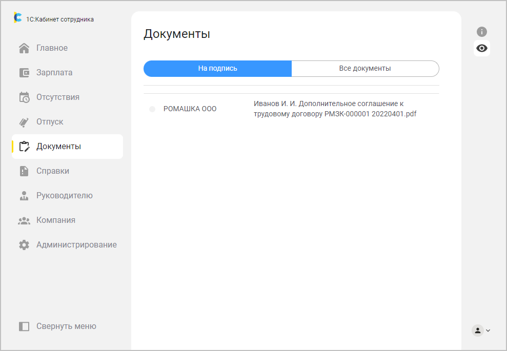 После публикации документа в сервисе 1С:Кабинет сотрудника такой электронный документ сотрудник увидит в своем кабинете, сможет его подписать, напечатать или скачать архив: