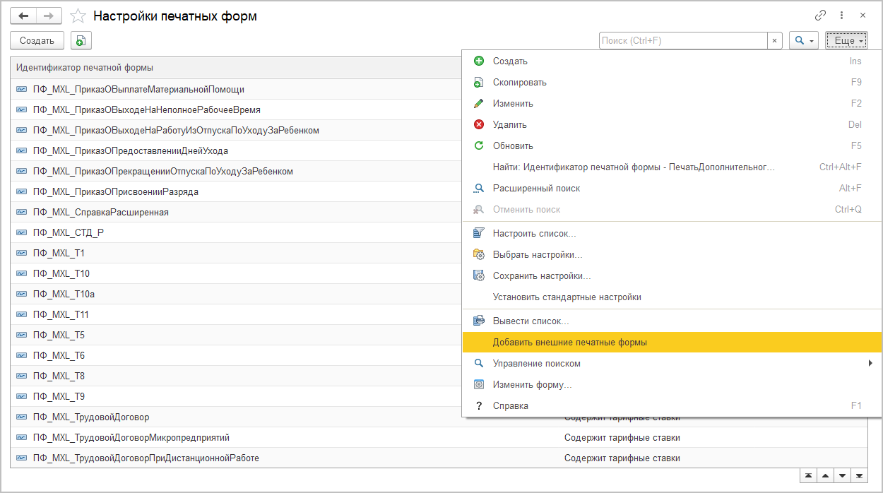 Для добавления новой печатной формы в меню Еще нужно выбрать Добавить внешние печатные формы: